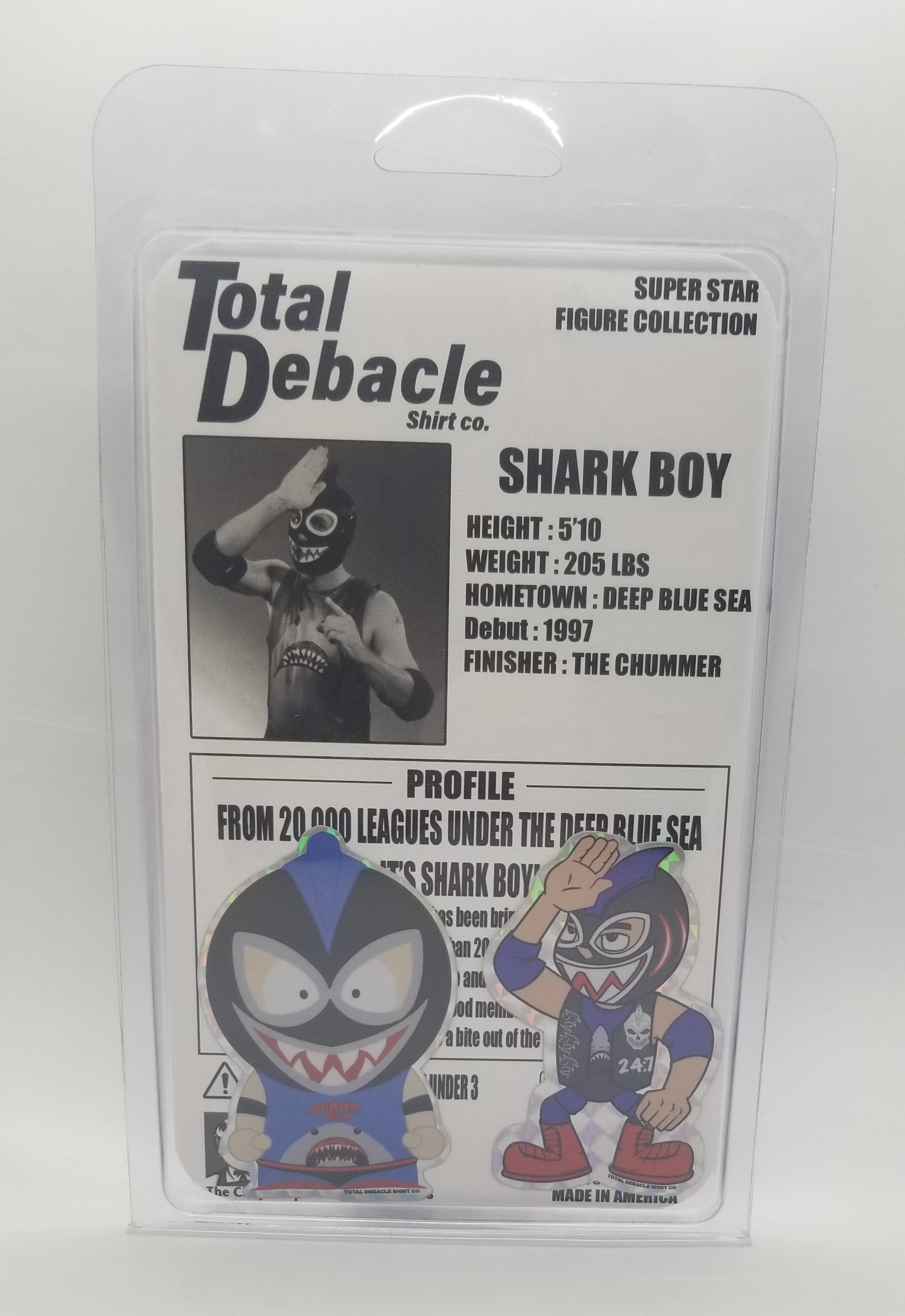 Oh Shell Yeah!!! Sharkboy is made of hand cast resin and I almost 4 inches tall. Comes with 2 stickers in a re sealable clam shell package.